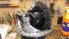 Then we get into some dirty hands as Barney's replacement differential needs a little work. First business is to adjust shims for the input pinion shaft bearings. Mark and remove the main carrier bearing caps to remove the differential and ring gear carrier from the housing. Remove the large front nut (impact wrench helps)