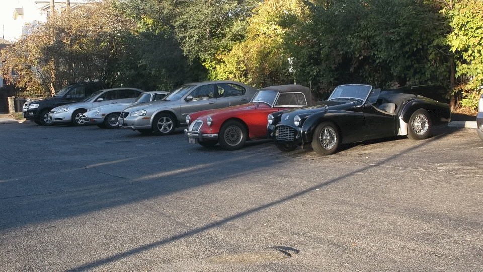 The second route instruction has an error, but most people do not notice and accidentally continue on the intended route. One gimmick early in the rally is a parking lot trick to drive in reverse around a square of four traffic cones in least time. I do it in 12 seconds with my MGA, but I lose. Three gals in sport-ute did it in 11 seconds. Go figure. Then we run out of fuel because we forgot to gas up before the rally, pull choke to keep it running long enough to get into a gas station. A short while later another error in the route instructions (a printing omission) runs the whole tribe off course so the rallymaster has to run us all down to direct us back onto the correct route (and we skip several questions in the process). Late in the rally I get pulled over by a cop while doing 5-mph next to the curb in a traffic lane on a 45-mph multi-lane city street. Fortunately I had 4-way flashers going, and the cop was in a good mood, so after explanation we got a smile and "Have a nice day". That was enough, and we left the last question blank and returned to finish.
