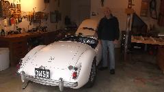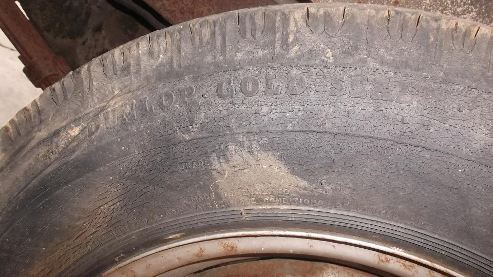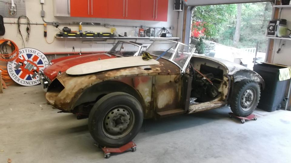 Today we have an early afternoon appointment with Ron Ramer on the west end of Cincinnati. He has a 1965 MGB (with later engine) already restored as a daily driver, and a 1959 MGA 1600 beginning a full restoration. First note on the MGA is that it still has one of the original Dunlop Gold Seal tires 5.60-15 tubeless, and one studded snow tire (just show how long it has been off the road.)