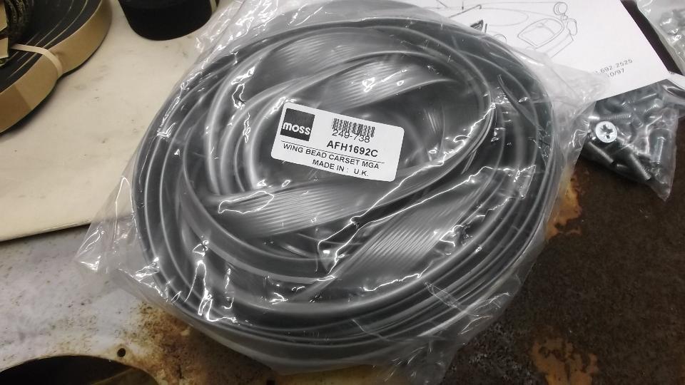 Try as we may, we have not been able to reveal the chassis number on the badly rusted frame. But we did turn up a bag of Moss Motors fender piping that is too thin and too narrow to use without problems. Kind of wish this stuff would go away from the market place.