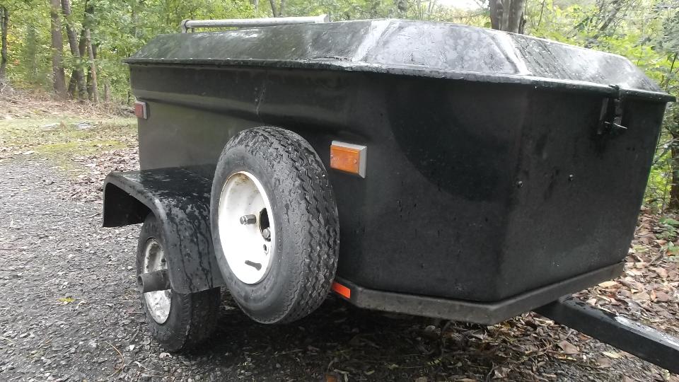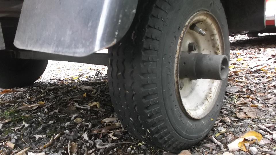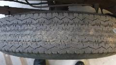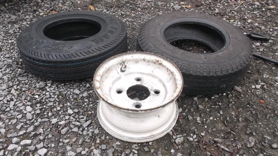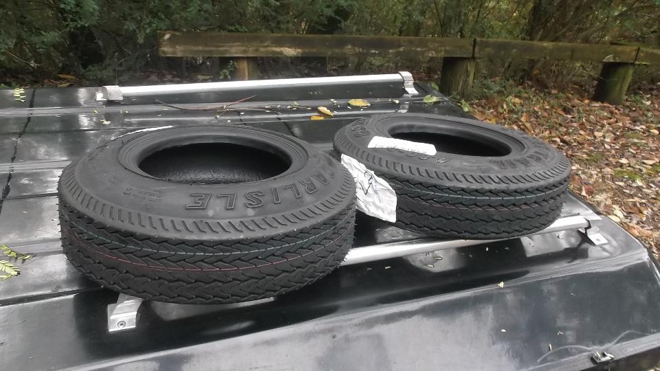 A little more (short term) future travel planning today, BBS, email with tech questions (as usual). I take advantage of a little "spare" time to finally install the new trailer tires. Old tires showing wear bars. Not a big deal, just a little grunt work for sweat equity. Toss the finished assemblies in the boot for a quick trip to a service station for air, and it's a done deal. Two new tires. New vs old.