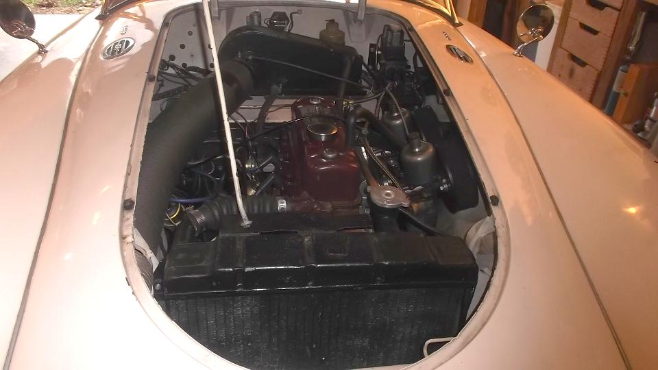 Today a quick shuffle 215 miles up the expressway (I-40 and I-81) to Christiansburg, Virginia, to visit Bob Stickley and his MGA 1600. This one appears to have an older body-off restoration with perfectly solid body sills (missing the lower body trim strips). The left door has suffered over-opening damage on the outer skin and has replacement hinges. Otherwise it is still in good daily driver condition. It was running a bit rich, so a quick carburetor tune-up was rendered before a test drive. Low oil pressure and knocking noise (under load only) indicates the need to renew connecting rod bearings (which Rob believes he can do for himself).