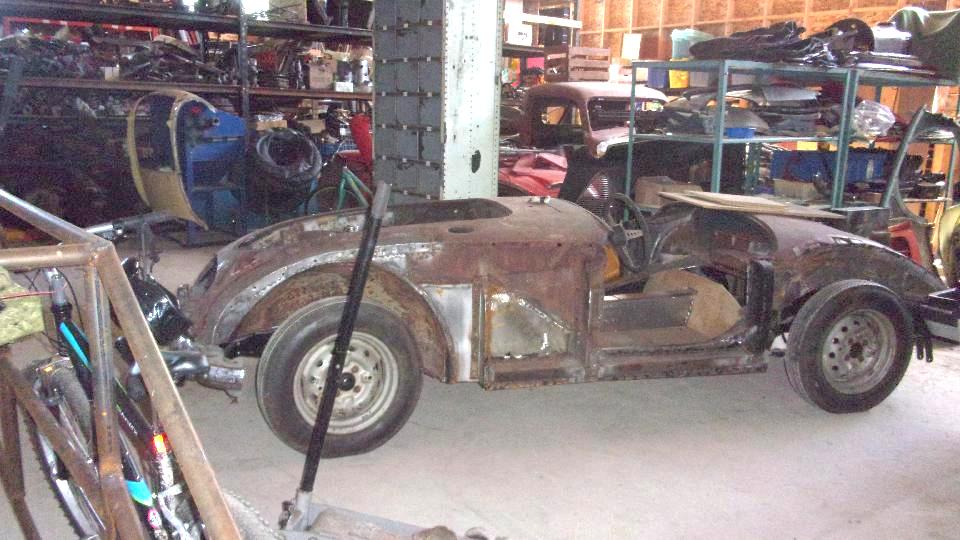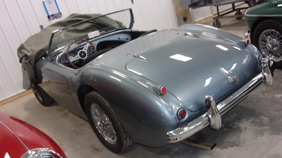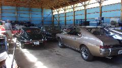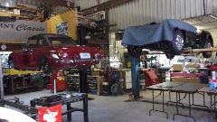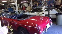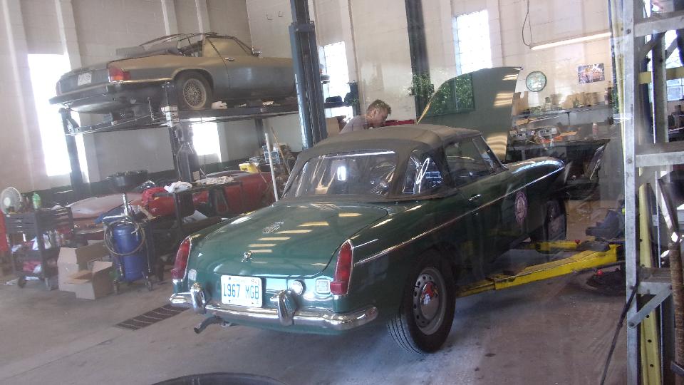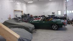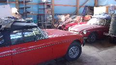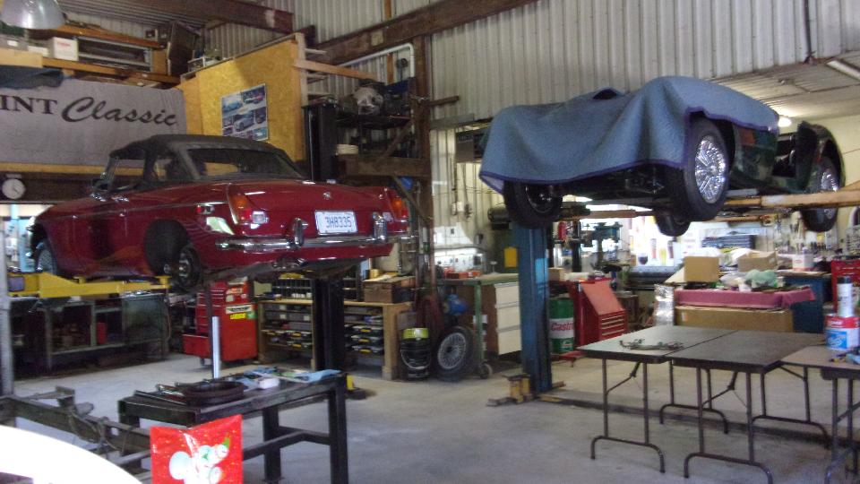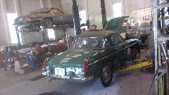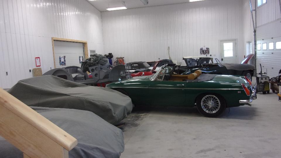 Above is the new shop, been here a few years by now. The front garage space is primarily short term storage of customer cars in process. We found an assortment of Healeys of course, including a Jensen Healey and an MGB.