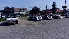 a Jag E-type, a bug-eye Sprite, a flat bonnet Sprite, a Lotus 7, a few modern Jags, a London taxi, a Triumph Continental, and I'm sure I missed some.