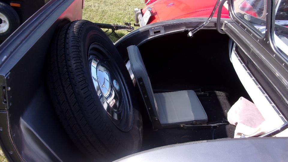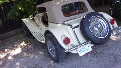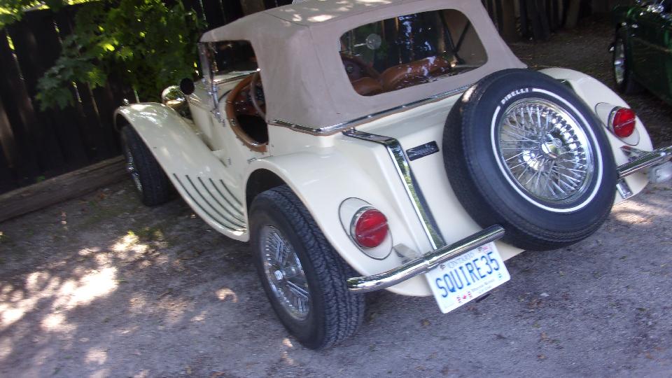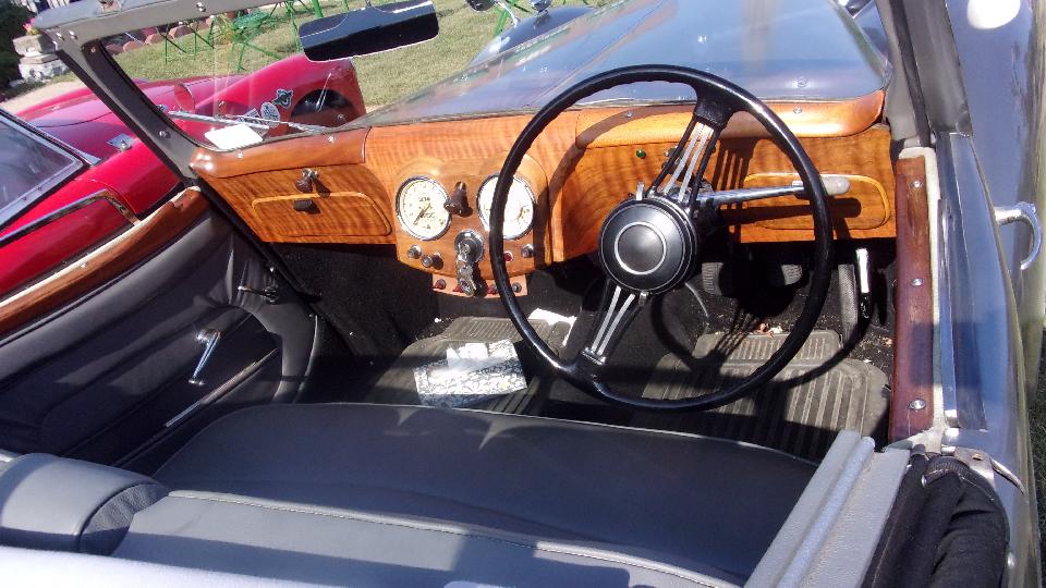 This one is an Intermeccanica Squire SS100 (#37 of 50 produced), a copy of a 1937-1939 Jaguar SS-100. It was commissioned by Auto Sport Importers, Inc. of Philadelphia, Pennsylvania and made by Automobilli Intermeccanica in Trofarello, Italy between 1970 and 1975 (reportedly by Fiat technicians who were moonlighting evenings and weekends). All were built as left hand drive and shipped to the United States. Body is hand laid fiberglass, radiator shell and headlights are hand formed metal, so not likely any replacement parts available. But it is a production car, not a kit car. Engines are Ford 250 cubic inch straight six OHV, manual or automatic gearboxes, Ford 9 inch rear axle, Ford A-arms but torsion bar springs up front, and four wheel drum brakes. So it is actually an American car built in Italy, just looks British. These cars have been appreciating considerably in value (yeah, collectors an be nuts).
