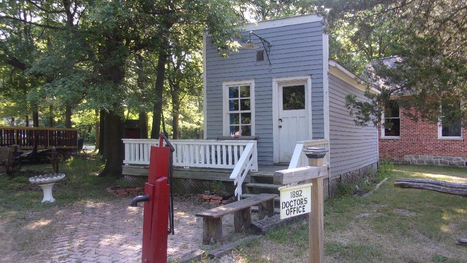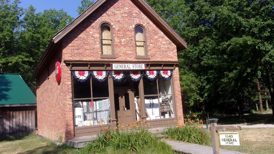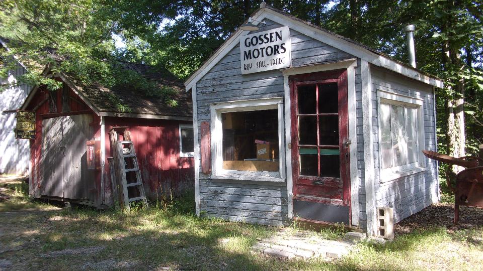 Turning the clocks back a bit, doctors office 1892, and the general store (1840). Gossen Motors didn't need to be too big, as there were not many cars back then. The red building to the left may have been the auto service shop, as the sign reads "British American Gasolene and Autolene Oils". There was some vintage horse and wagon tack over the door. The grey building on far left may have been the black smith shop or stable (or both).