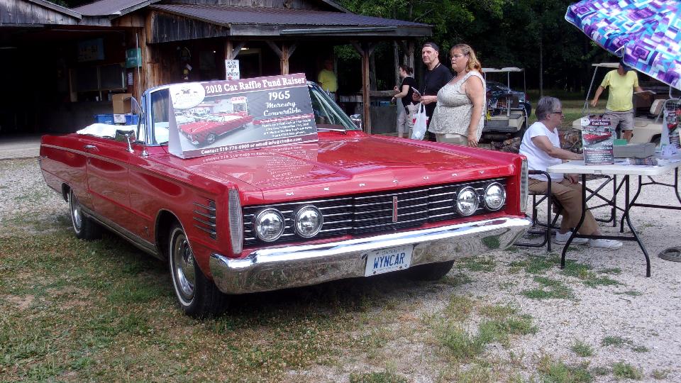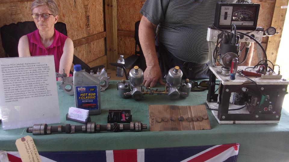 We found a table for Old English Car Repairs shop displaying a worn camshaft to bring attention to Lucas motor oil with high zinc content. Also a set of MGA carburetors and a dwell tester on an ignition test set-up, including four spark plugs in a compression chamber subject to 150 psi compressed air to emulate engine cylinder compression. The green MGA was shuffling around a bit during the show. The 1965 Mercury was pedaling raffle tickets, but no idea when it was to be given away.