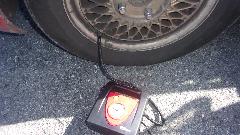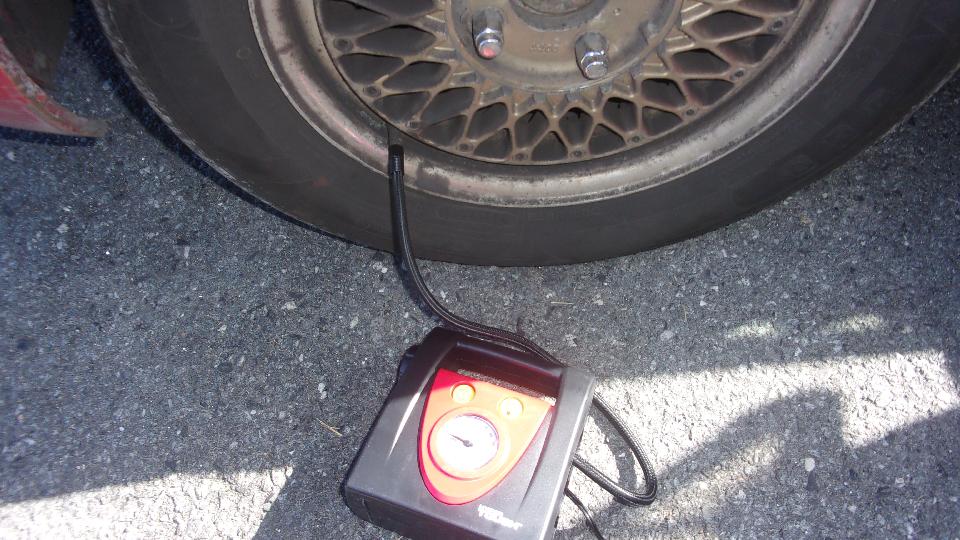 A little quickie maintenance in the morning while the engine is still cool. Fan belt was squealing last night, so tighten the belt first, then check/adjust tire pressures all around, and reduce engine idle speed a bit (after resetting the points a couple days back). Then of to a WiFi spot for breakfast.