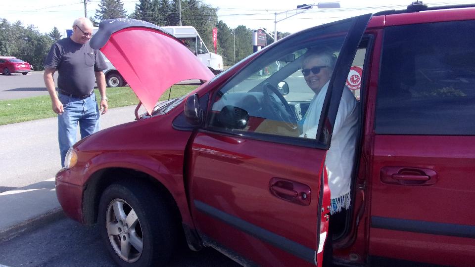 Early morning we hauled on 70 miles farther east to a fuel stop in Edmondston (still in NB), and a Walmart for restock of engine oil and gear lube (preparation for next oil change). Returned to the car park to find a local bloke checking out the rig, revealing he has a nice MGA just a few miles away. He was amazed to find out who I was, having spent lots of time on my web site while he was restoring his car (we seem to get a lot of that these days). He had to pick up his wife at the hair salon, but they would meet us at the local Tim Horton's where we were about to stop for breakfast.