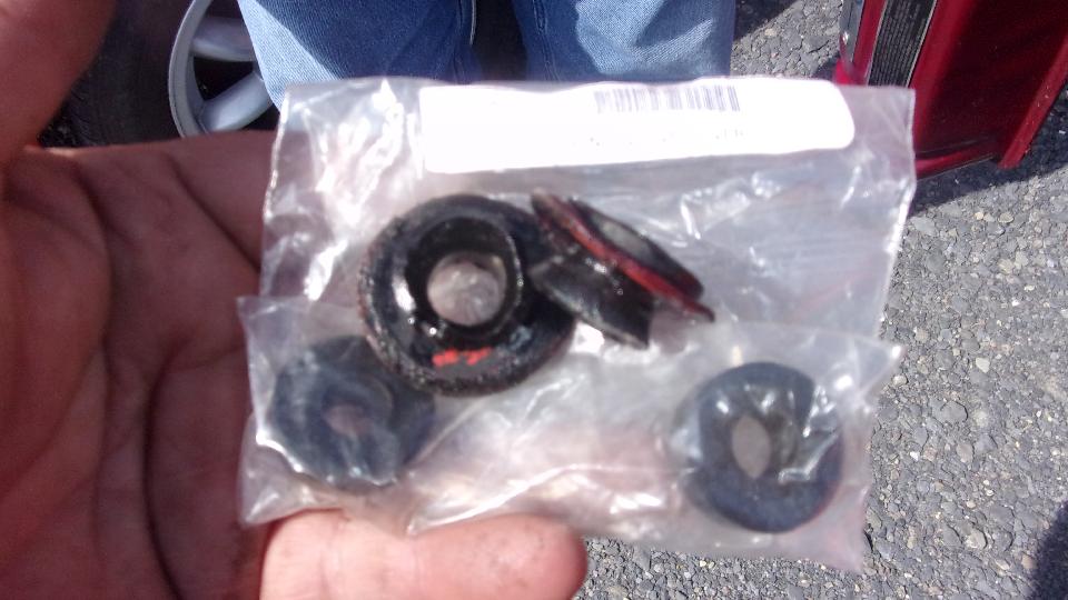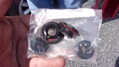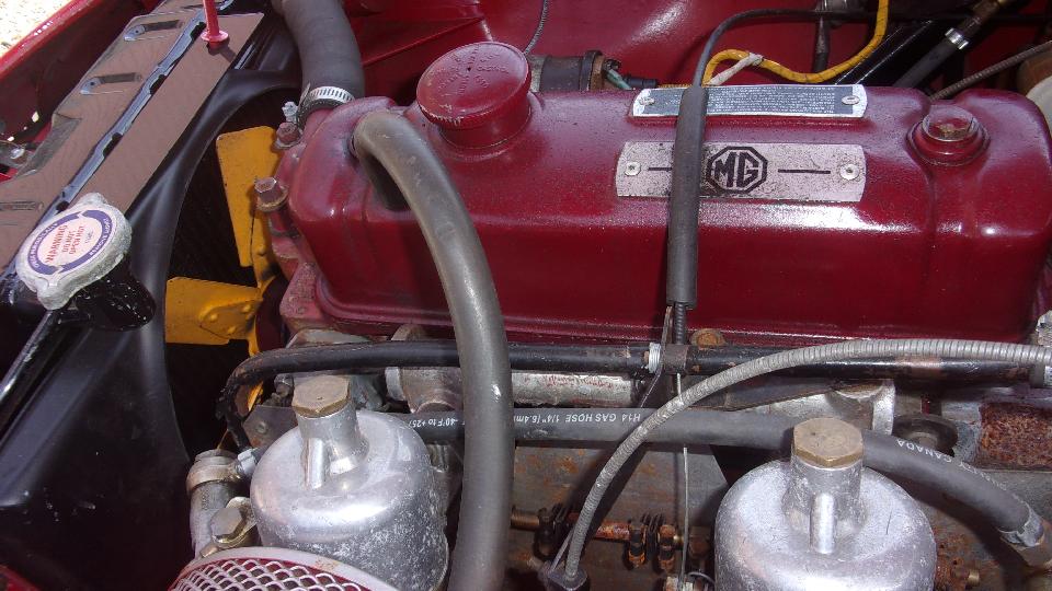 Several minutes later we were pulling Real's MGA 1600-MK-II out of the garage for photo-op and a listen to see how it was running. The bumper overriders are upside down, and the fan blade is backward, but those can be fixed later. When it was (previously) discovered that the 1622 engine had a "15" head (causing very high compression, pinking and run-on), the head was changed to an 18 "L" head (1972-1974 MGB). Nice head with larger intake valves, but shallow combustion chamber requiring clearance eyebrows in the engine block, and it still has the run-on issue due to high compression (even running on premium fuel). Someone needs to do a compression test on this thing. It fired right up and ran well with carburetors seeming to be in good tune, but it had a funny knocking noise, not bottom end but maybe a rocker shaft assembly issue. We pulled the valve cover to check valve clearances, and those seemed to be okay. In the process we replaced the rubber grommets with new ones pulled out of the magic trailer. Thinking we might need to check for wear on the rocker shaft (maybe later).