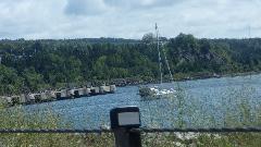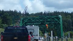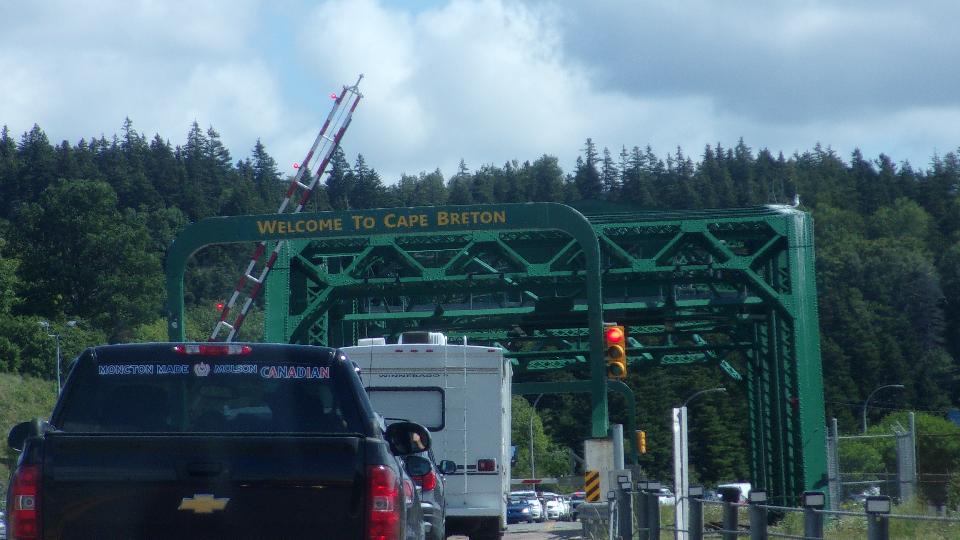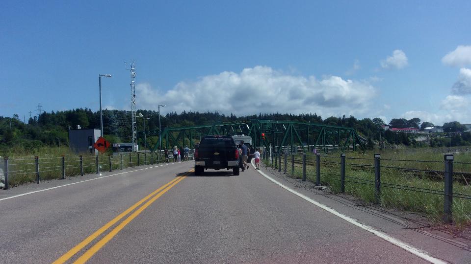 Breakfast and email, haul out at 10:30-am with three hours to go. Half way along at Port Hastings we had a brief delay for a rotating draw bridge to let a small pleasure craft through the lock. Note that the draw bridge is labeled "Welcome to Cape Breton", which would actually be Cape Breton Island, which is the eastern end of Nova Scotia. We were still 77 miles from our destination in Cape Breton Regional Municipality (population 94,000).