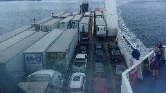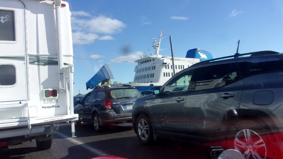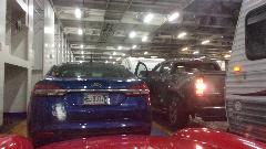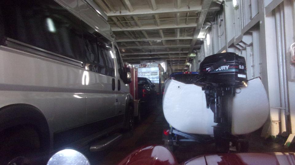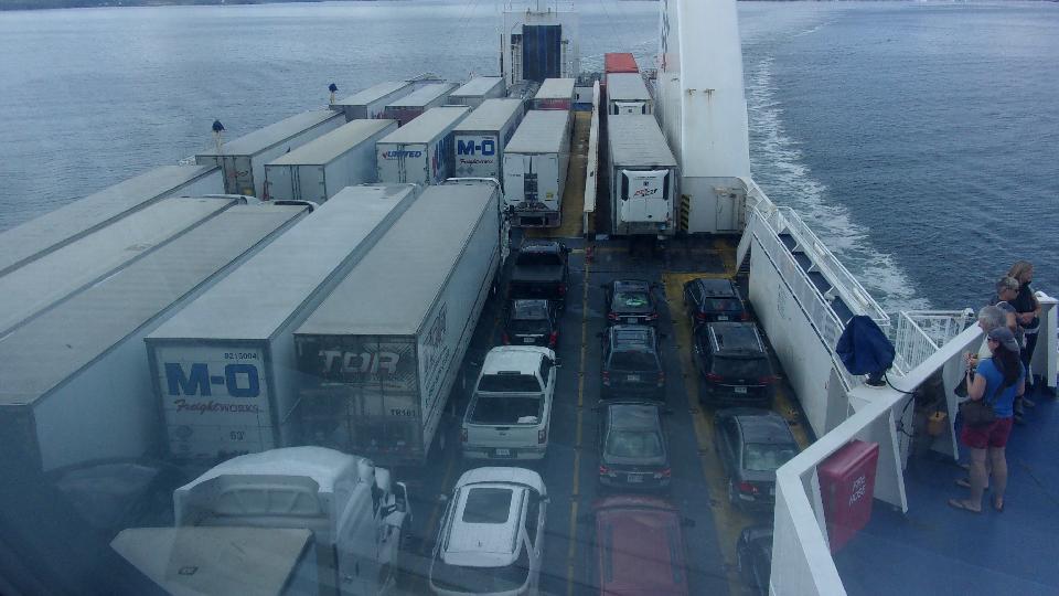 Hopped a ferry from North Sydney, Nova Scotia to Port-Aux-Basques, Newfoundland. We drove in at ground level and parked on level 3 with trucks and trailers, up to 8 lanes wide mid ship. More trucks and cars on Level 5. Cars only on levels 2 and 6. Passengers and cabins on levels 7, 8, 9. This thing is huge.