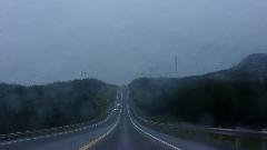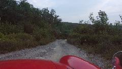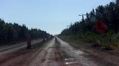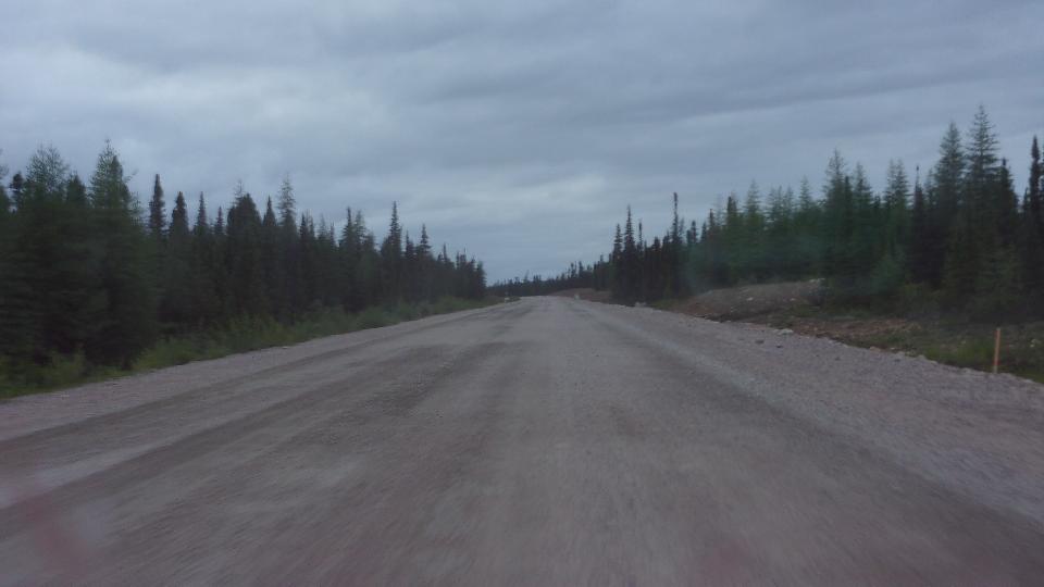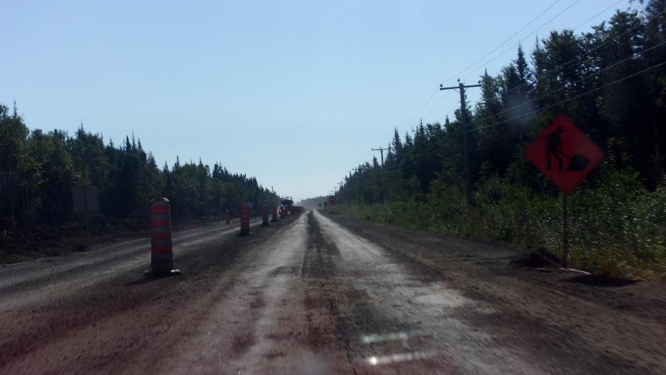 Early afternoon heading out, get second fuel fill for the day 15 miles west of Labrador City, and keep going. Then in Quebec heading generally south, mostly paved (sort of) with 42 miles of fairly ratty gravel road with some cobblestone, hills, twists, repeated rough railroad crossings, then back onto (rough) pavement.