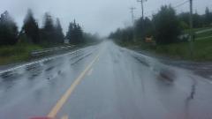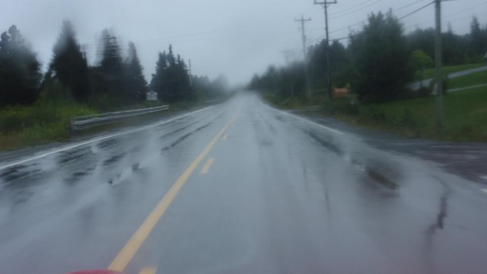 Heavy rain in the morning, continuing through to the evening. Checking weather forecasts to the east, we decided to sit it out and use the time to catch up some grunt work (including email and photos and notes for three days). Good move, as the sun popped out briefly around 7:30 pm, we would wait a while so we might not drive back into the receding storm front. Heading east again 11-pm, stopped in New Glasgow 1:45-am as we were just driving into the rain again.