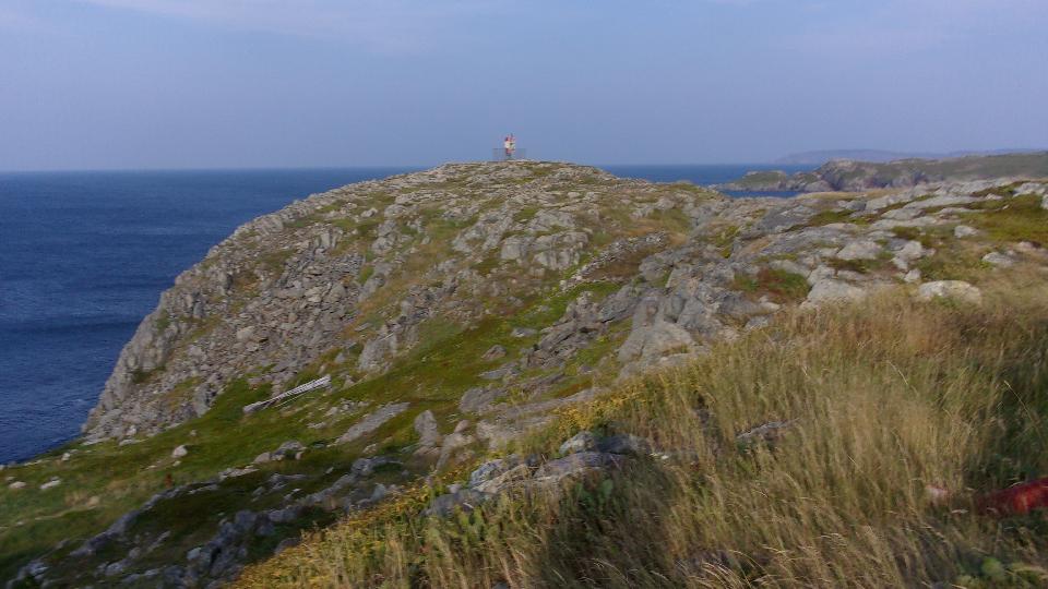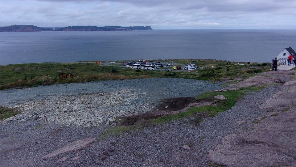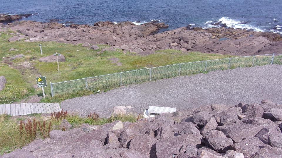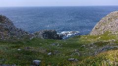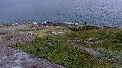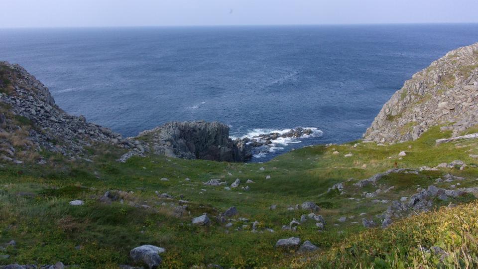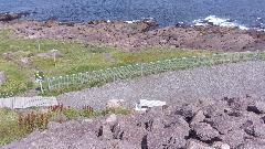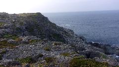 Turning around again for another picture, yes that car park is where I started. Now I get to hike back there, and that much farther again toward "the beach" (like as if there was one). Skipping the trail again, I took a shortcut down the rock ridge a bit away from the cliff. When you get all the way down there is a very irregular rocky shore line at the bottom of a cliff, the kind of barrier that likes to kill people. There is no convenient trail to water's edge, so I may have to wait for another opportunity to get my feet wet in the North Atlantic Ocean. There were lots of information signs here about sea birds and whales and fishing and shipping.