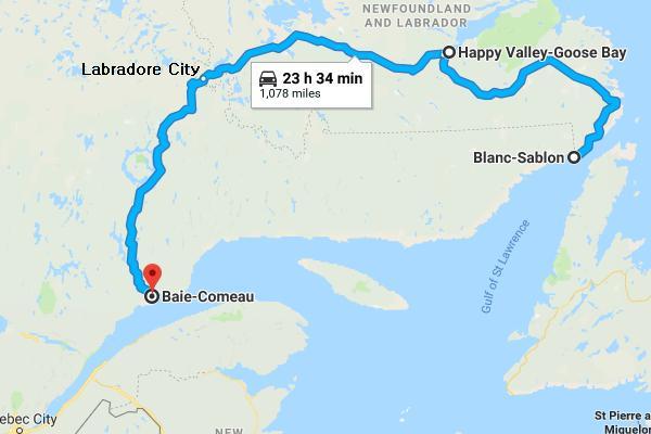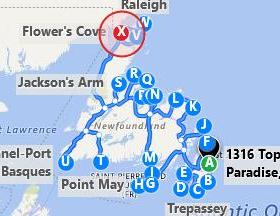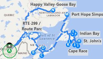Newfoundland, with some hope of return by way of the Trans Labrador Highway north of the Bay of Sr Lawrence. Click on map for larger image. We have a few "small" problems with the automatic routing, like a 20 mile jump between K and L, Point May and St Jacques, that plots out as a 417 mile loop to the north (seems like there should be a ferry there). Also 200 miles between M and N (Port Hope Simpson to Happy Valley-Goose Bay) that plots out as a 1935 mile loop to the south. That one has a road on the map, Rt-520 Trans Labrador Highway, but the routing program seems to choke on it. We will have to find out if it is passable.
