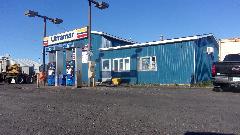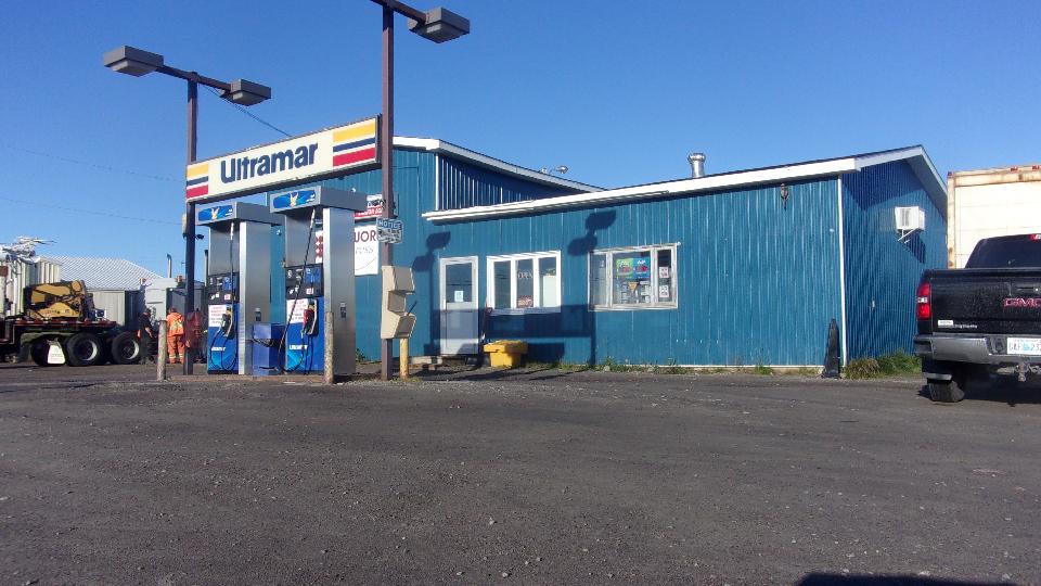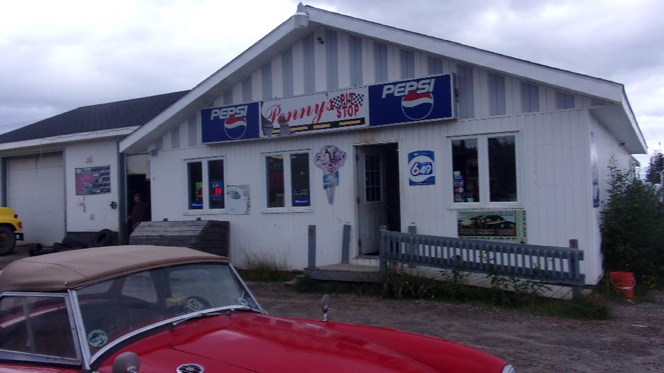 Okay, the roads weren't all this bad. In few hours we were docking for fuel again at Penny's Pit Stop in Port Hope Simpson. Fuel getting a bit pricey up here. I think that works out to $4.50/gal USD. At least we found some sandwiches and one table, and there was a WiFi connection here.
