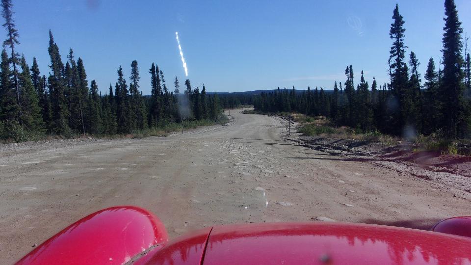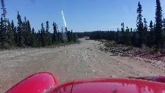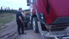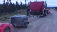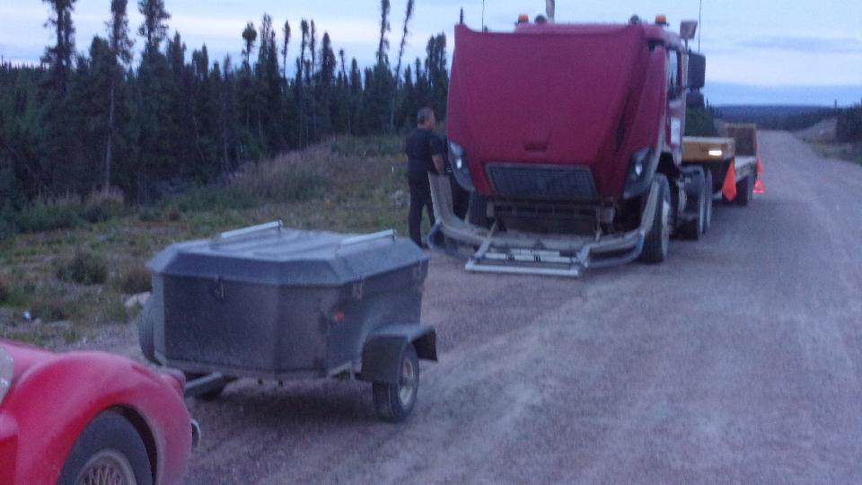 After a very short WiFi session we headed west on the Trans Labrador Highway, destination being Happy Valley-Goose Lake, NL, 254 miles away. Yes mostly gravel, but not too bad as we were making about 45-mph (when we were moving). Kill time for a few road construction stops, and then off again. Just past half way (135 miles) we had a slight delay to assist a stranded semi truck. The trucker had been sitting there from 2-pm to 8-pm waiting for his help to show up by 7-pm. Long story, but just a broken fuel hose, not too hard to fix. By now you should know the magic trailer has fuel hose and clamps and tools.