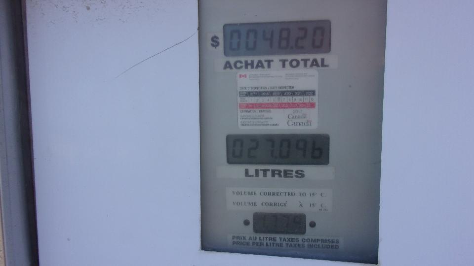 Had to make the next fuel stop in a little place called Relais Gabriel where petrol was $1.779-CND per liter). I recon that's $6.75/gal-USD, take it or leave it, 7 gallons please. Topped up and enough to get