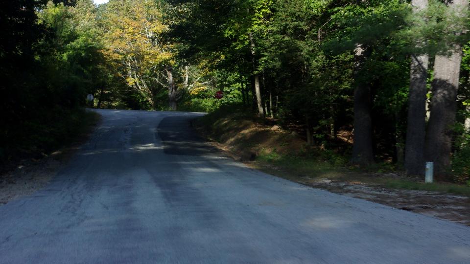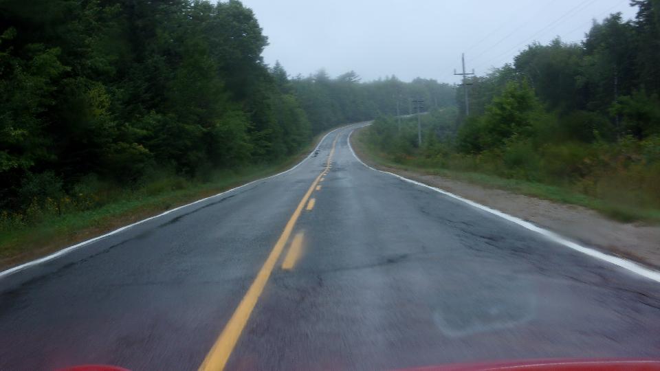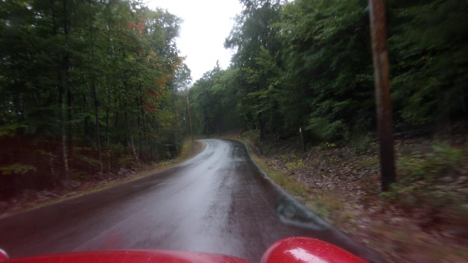 Yeah, this is the way I remember New Hampshire, tree lined twisty asphalt roads, sometimes dribbly rain, and figure on 35-mph average speeds because there are very few expressways here.