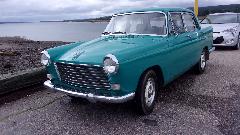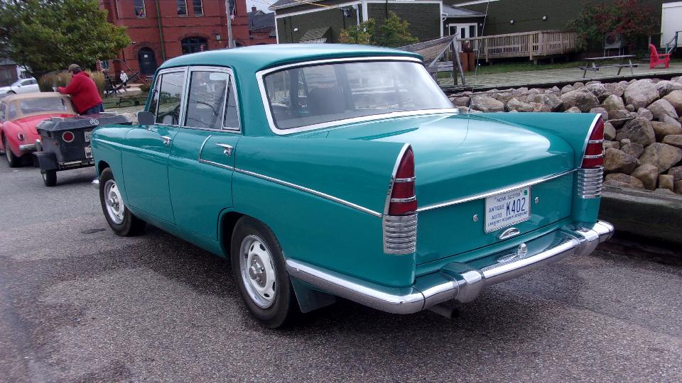 After lunch, back to the wharf to kick tires for a few minutes. Same Healey we met the day before, but the Austin A55 Cambridge Mk-II saloon (first "Farina" model) was new, 1960 I think. All badges were removed before repaint, so the owner wants you to guess. The Austin Cambridge was a rebadged Morris Oxford Series V and retained the 1.5 liter Austin B-Series engine (but SU carburetor), another variant of MGA, produced in parallel with the MG Magnette Mk-III.