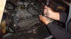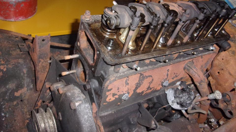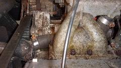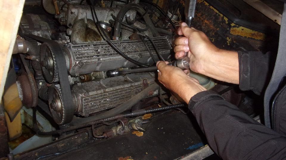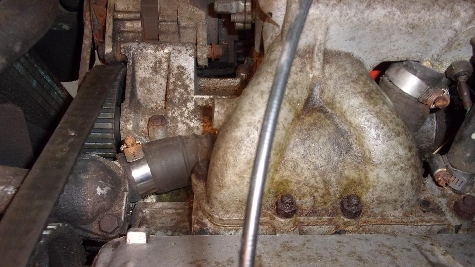 find very low (30-psi) pressure on #2 cylinder. A little oil in the cylinder brought compression up to 90 implying bad ring seal, not great, but should run. Fired it up again, still running on three cylinders with loud popping on the exhaust side. Hard to see underneath the inclined engine, but I recon it is probably a failed head gasket blowing out the exhaust side. Bummer, but at least it ran, and the owner may now be motivated to at least make a decision about what to do next.