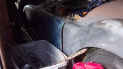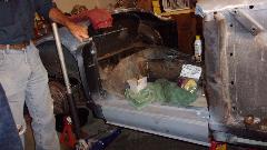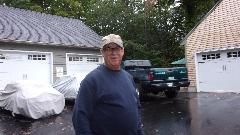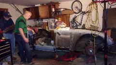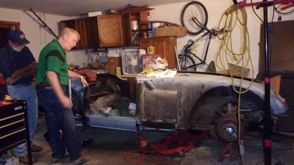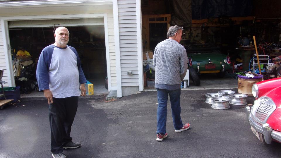 Nice visit, but after a half hour of eye candy we had to get moving again. Sucking air, so a quick stop of gas, then another hour and quarter to make 37 miles southwest to visit Geoff Bird in Atkinson, NH. Officially into fall with shorter days, needing to get used to dark at 7 pm, that's Geoff on the left with another friend. The car is an MGA 1500 with MGB 3-main bearing 1800 engine and MGB flywheel and clutch. A variety of body reconstruction issues here, like the left side B-pillar leaning forward 3/8-inch at the top, needing to be realigned and rewelded, and badly shaped "new" rocker panels that need to to be dramatically reworked or replaced.