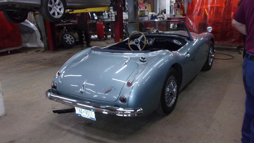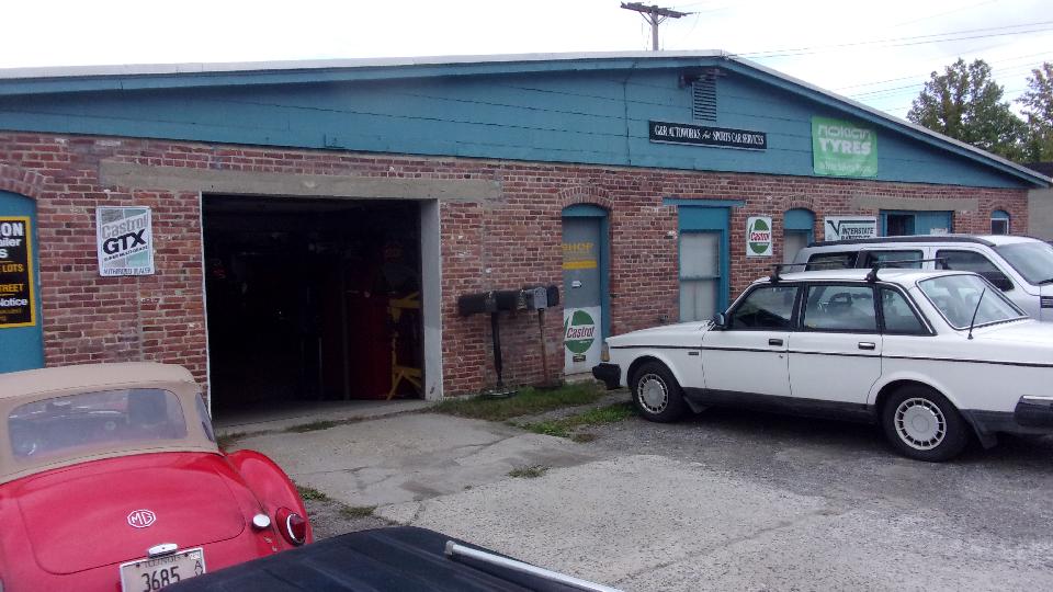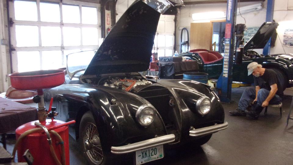 Allan then recommended that we should go check out G&R Autoworks in Keene, New Hampshire, less than a mile away, because they work on some British cars, so we got the directions and wandered over. There were immediate signs of redeeming social value with a big Healey and a vintage Jaguar on hand.