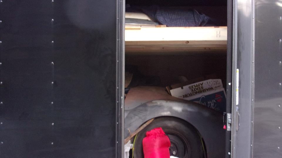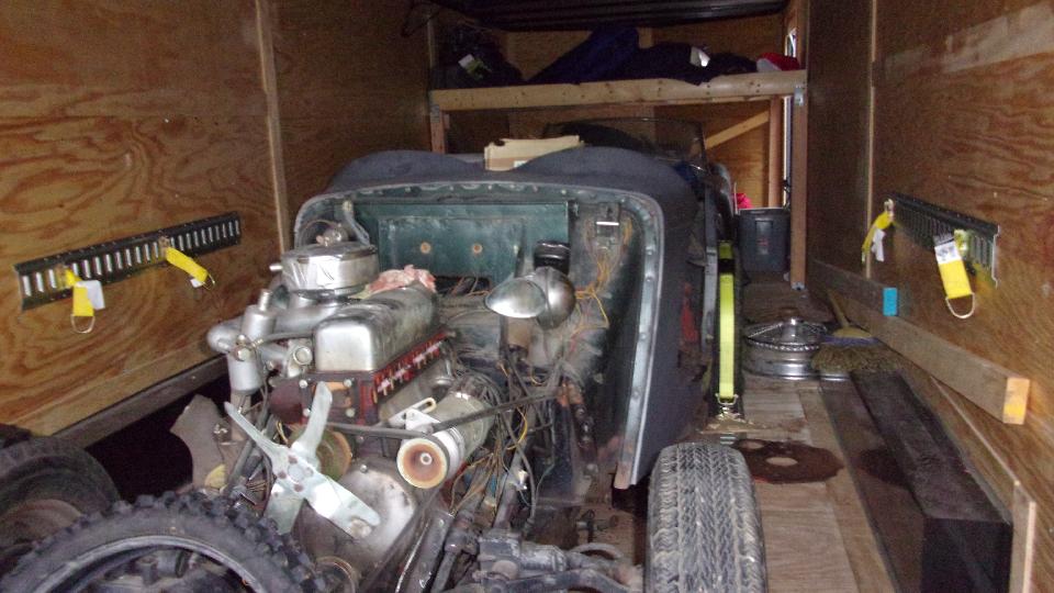 So we hopped into his "new" (24 hours old) 1997 Jaguar and headed a few minutes down the road to check out his new toys. There was a new trailer, purchased specifically to haul home the two cars from the more arid part of Colorado. There was a mezzanine deck built in the front quarter of the trailer for hauling loose parts. When first loaded it was carrying these two cars, the full drive line for the MGA with another spare engine, the TD with boxes of parts, and five motorcycles (don't ask).