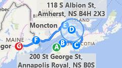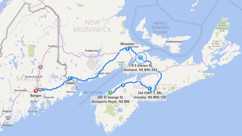 The "D" point is Amherst, NS. We sat here for the day catching up photos and notes, email and tech questions, and doing a little review and planning. Had flaky WiFi connections for a few days, not able to upload anything to the web site, so that will have to wait. Looks like we have done up eastern Canada, so it's time to get out of Nova Scotia and head back east. Moved up to Moncton, New Brunswick late night.