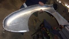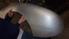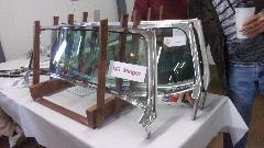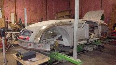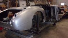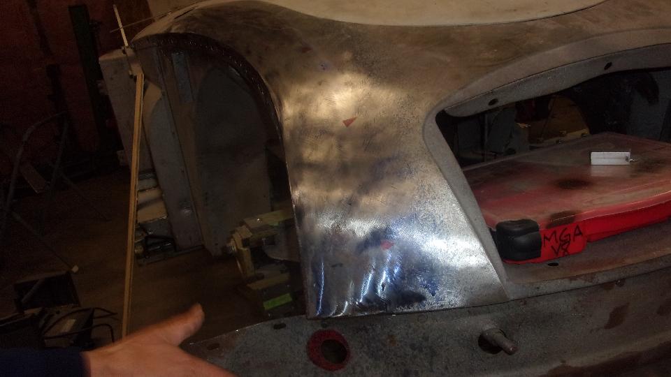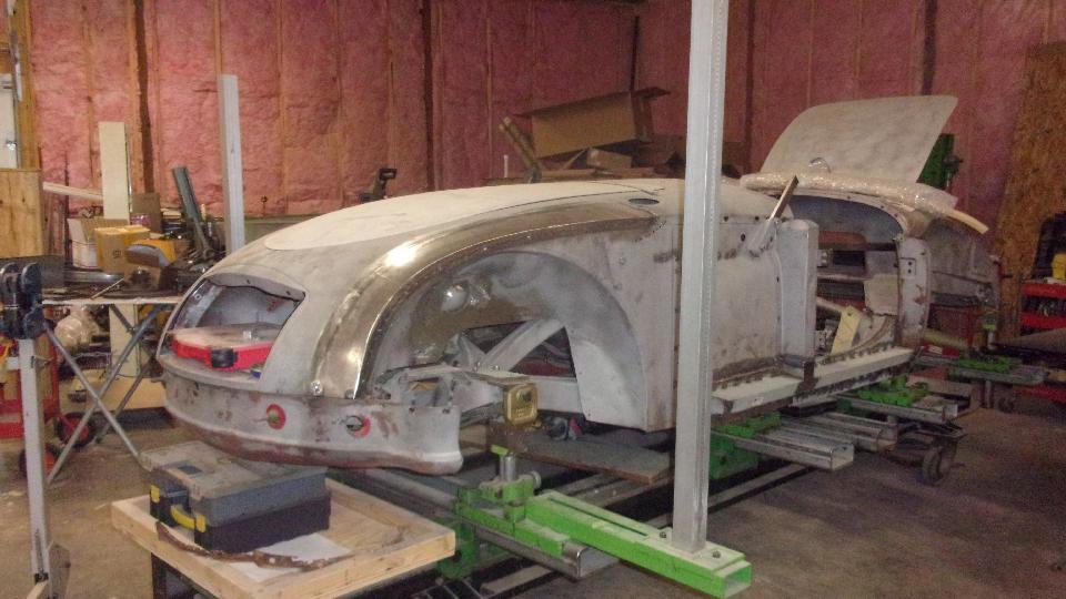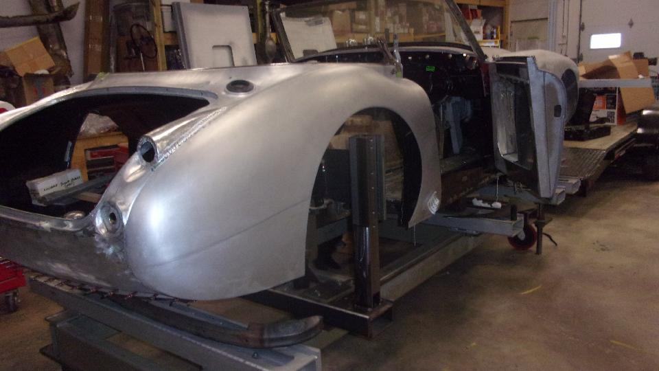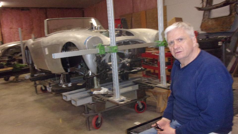 I was most interested in the MGA Twin Cam body shell he was restoring, mounted on a heavy machined frame alignment jig. All of the repair patches are perfectly aligned, butt welded and ground flush, completely hiding the weld joints. Among the best body restoration work I have ever seen.