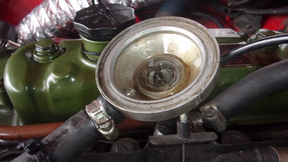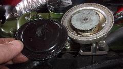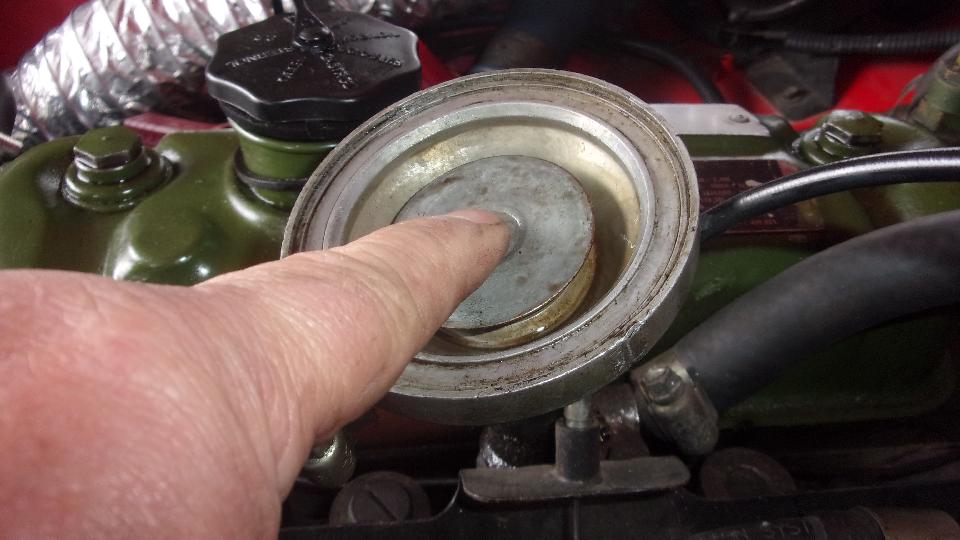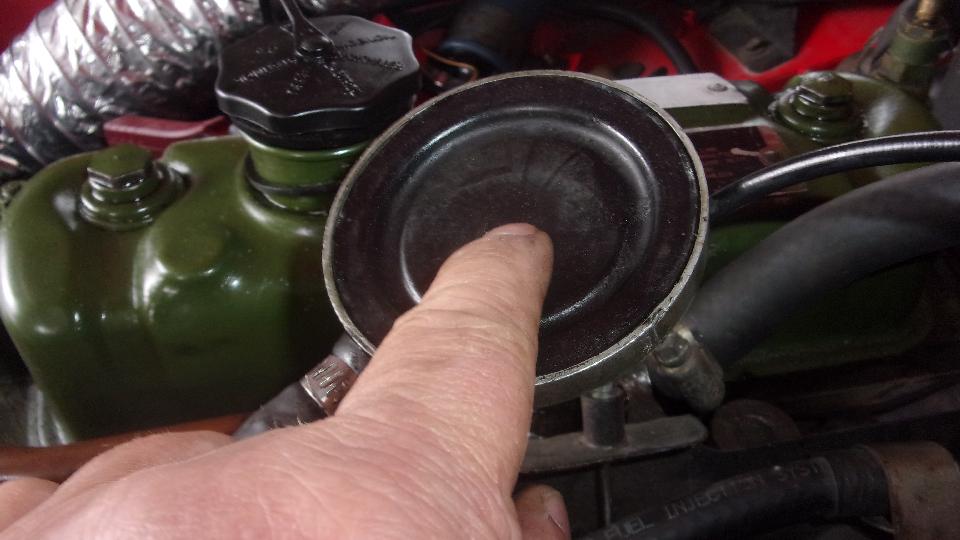 Then we opened up the PCV valve and found the rubber diaphragm wrinkled up and sucked down inside. So disassemble and reassemble it, bending the closure clip to be tighter, and the PCV valve was working again.