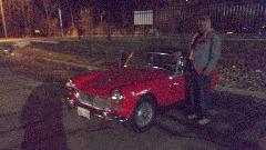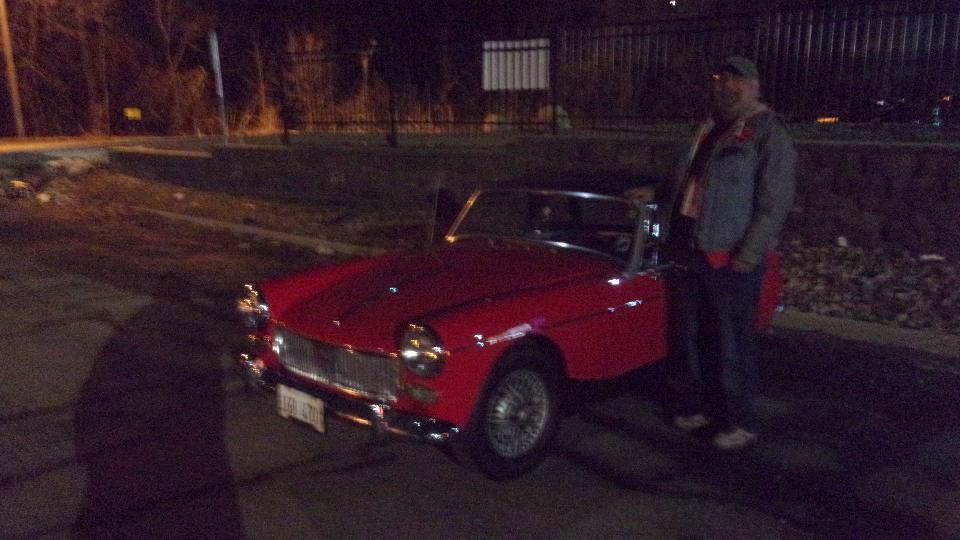 Getting out of Chicago in mid afternoon, we headed to Addison, IL in the western suburbs. We had enough time to drop navigator Elliot off, then go 8 miles extra to pick up daughter Honey and return. Killed about an hour with family, then another hour for dinner before the Chicagoland MG Club meeting where John Twist of University Motors was the guest speaker (with about 40 club members in attendance). Missing an HDMI cable to connect computer to projector, so someone ran out and bought one. Then had a party of experts to figure out how to enlarge the projected image in Power Point, followed by a downright entertaining presentation by John Twist. After the meeting Sparky was crowing to John Twist (typical prankster) about his nicely running MG Midget. I got a picture of Sparky's Midget in the dark as folks were leaving. Then ran daughter Honey home and returned to pick up son and navigator Elliot.