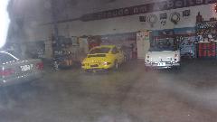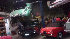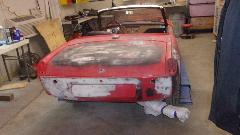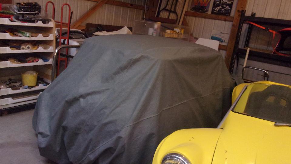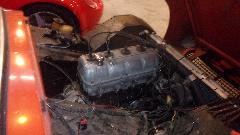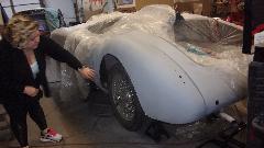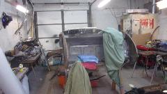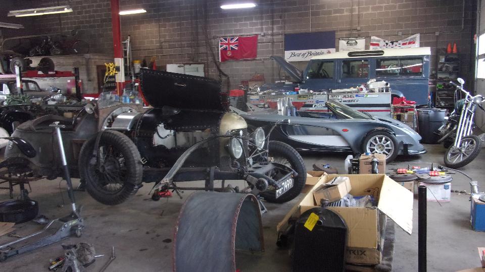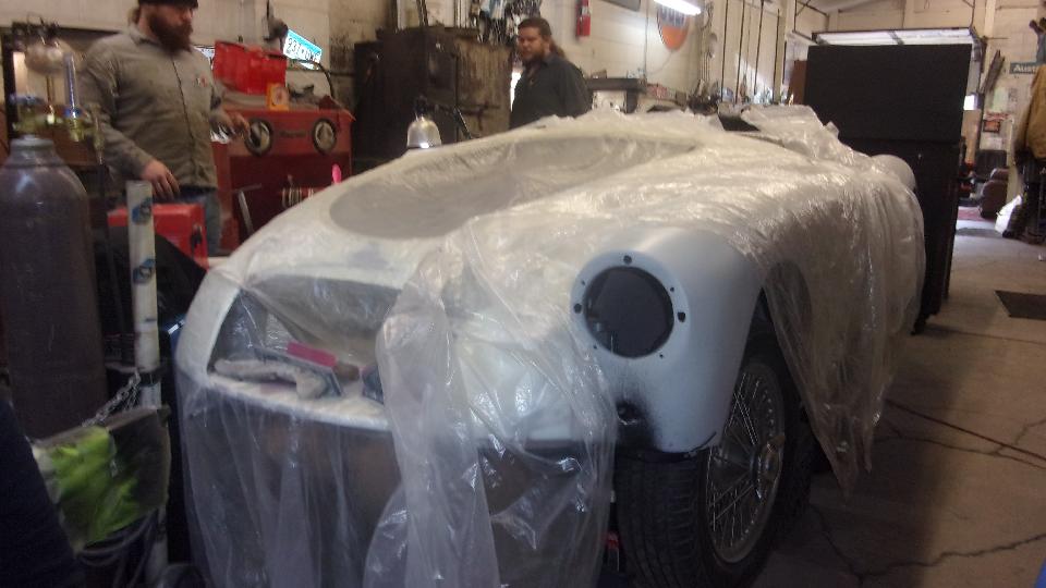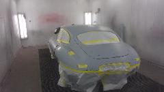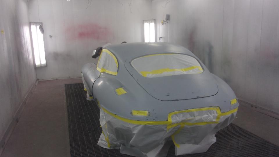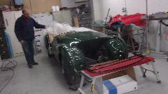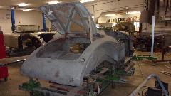 Back in the corner obviously a Mini under the tarp. In the paint booth, a Spitfire with Weber carburetor, very close to finish paint and soon to be looking very new.