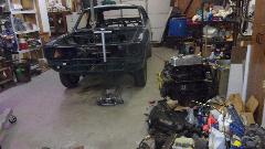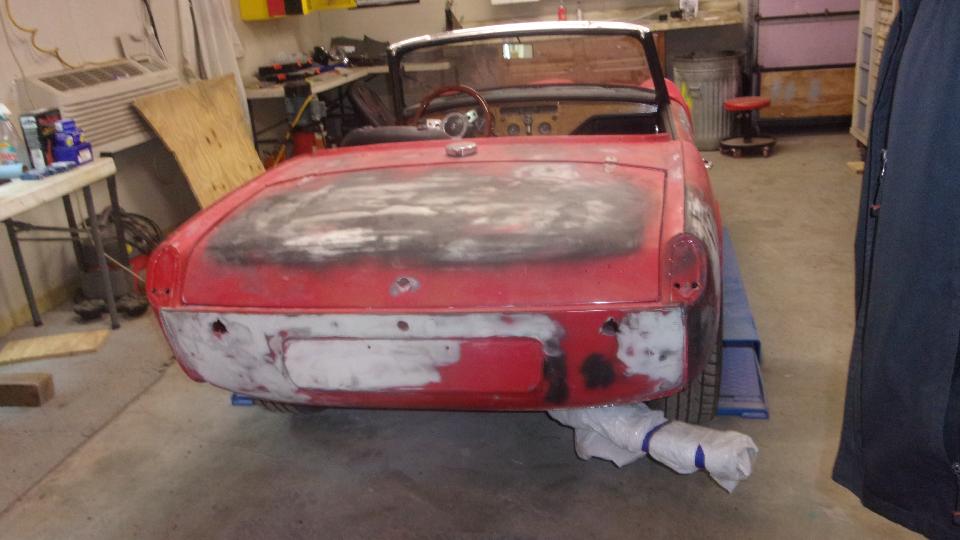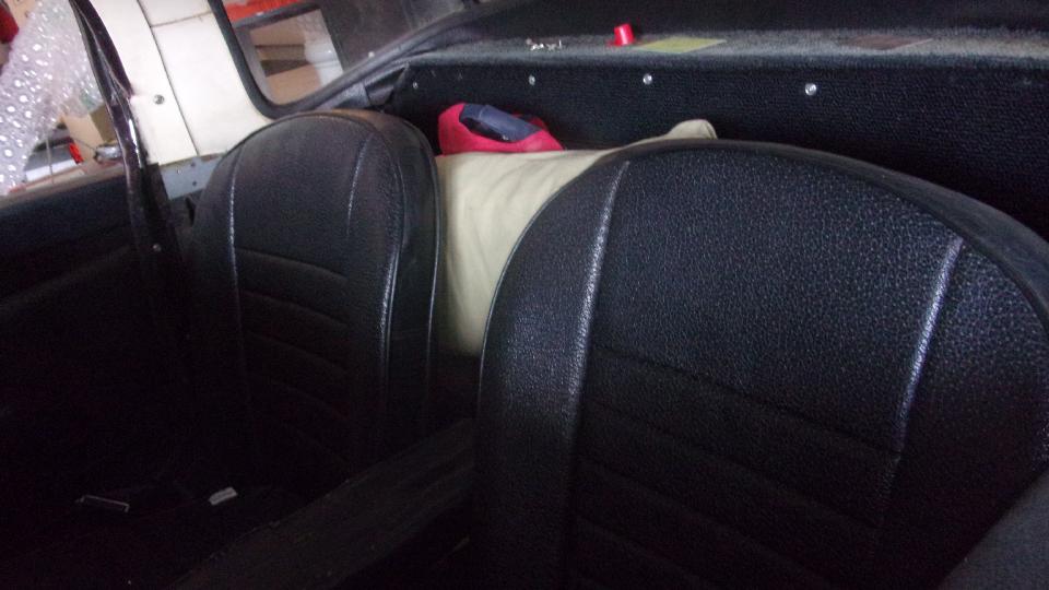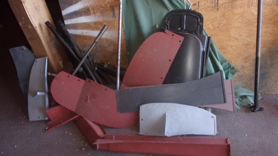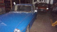 The car is a 1500 model with a 1600 engine (with MGB carburetors) and a spare 1600 engine. Seats were recovered with heavy vinyl some years past, still holding up quite well. Unfortunately the chassis frame has suffered a lot of corrosion, so Glen has procured a replacement frame that its in particularly solid condition. We spent some time looking at a few vintage replacement sheet metal parts, figuring such things were not so good in the 70's, so he might be better off making new panels rather than fighting with the vintage parts.