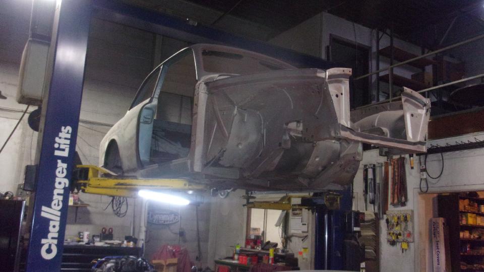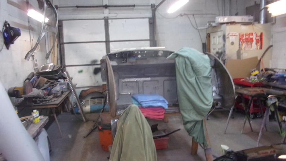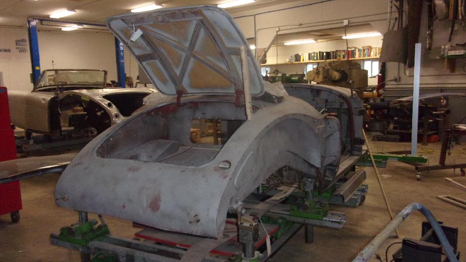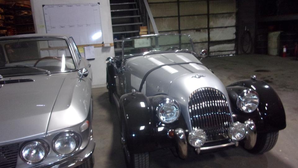 Inside it is immediately in your face full of cars in process. The shell on the rack is a Volvo 122, while the sweet thing on eth floor is easily a Morgan Plus 4.