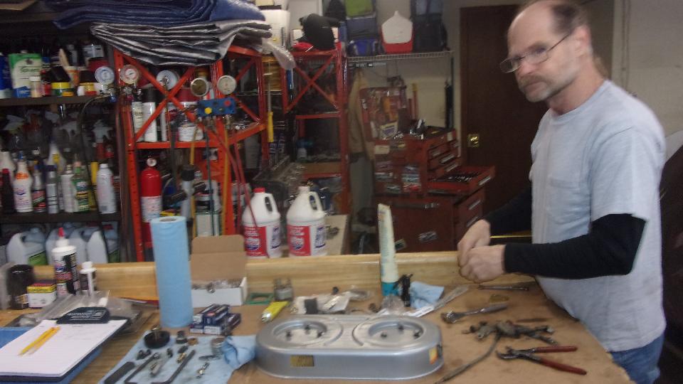 We had a little maintenance to do on my MGA, nothing big, so just pulled it into the center bay of the garage. Began by installing new ignition points, as the prior set had worn down the rubbing foot so far that they could no longer be adjusted. Then jacked up the rear end to change oil in the differential, followed by chassis grease job, brake shoe adjustment, and a minor mod (crush with Vice-Grip) to the replacement wiper wheel box to stop the drive pipe from slipping out (aftermarket part defect). Nice to have all that done. If no one else was coming, at least we could stage our own tech session. Sorry, too busy to take pictures in process, but just simple stuff.