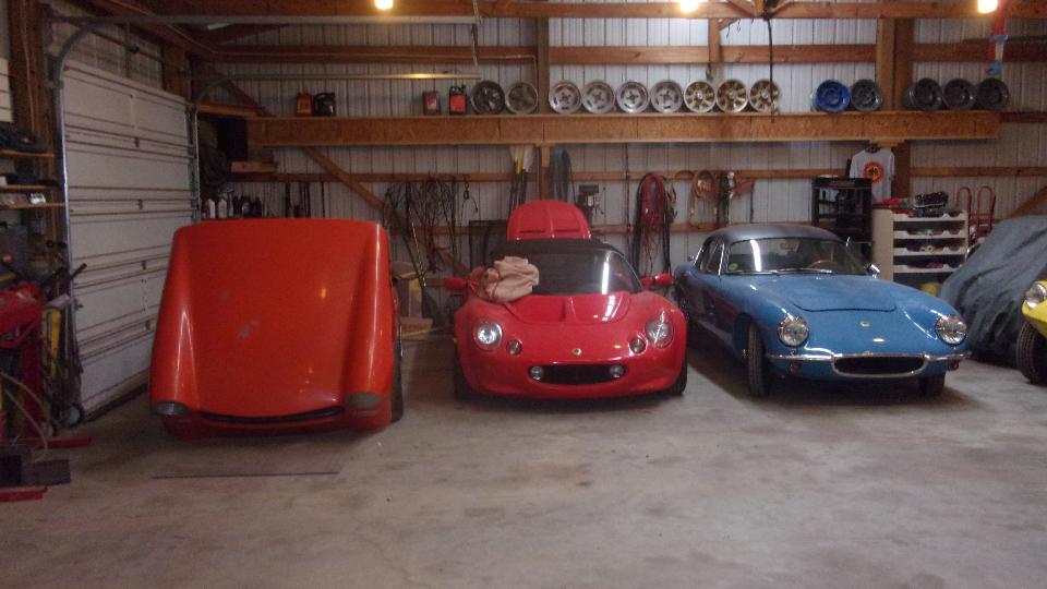 Then we wandered out to his workshop, down the hill from the house. Oh, drool. This is where the club tech session would have been held (if it wasn't so cold). There was that big yellow TR7 up there in the rafters (well, just on a hoist), and the yellow dune buggy (don't recall the model name, but I don't think it was British). Guess I didn't mention yet that he likes Lotus, with a nice story about how he spent half a life time chasing after the vintage Elite before he caught it, and also has a modern Elise (with Honda engine I think). There is also a (flat bonnet) MG Midget with a swing forward bonnet, similar to a Bug-eye Sprite), and carrying a Toyota engine.