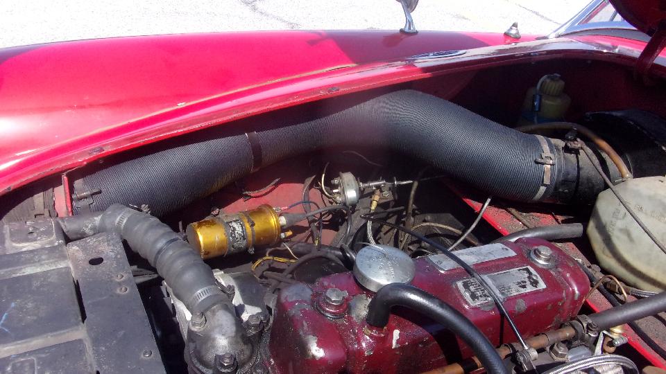 All that aside, when we finally got the packages it was time to open the large box and unpack the contents, transferring most of it into a large tote box in the trailer (and dispose of the shipping box). One item in particular would not pack well, that being the large and somewhat fragile 4-inch air hose for MGA heater inlet, so we took a few minutes to install that in the car rather than packing it for carry.
