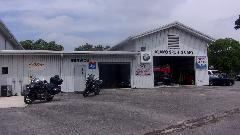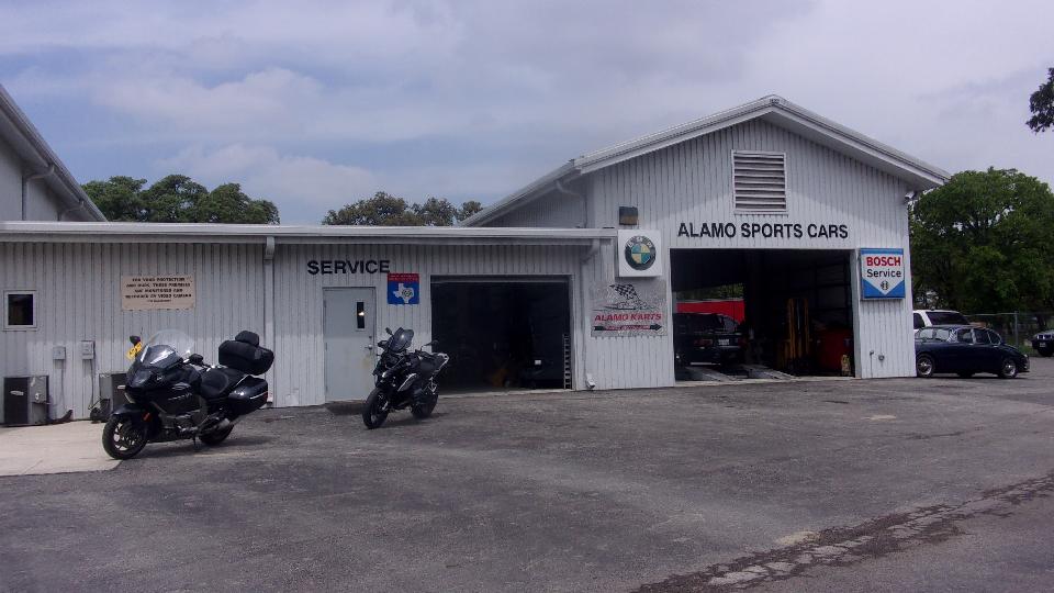 (north side of San Antonio). All the way down here to visit one shop that was not on our list last time we were cruising around Texas two years ago. This is Alamo Powersports, and the handsome fellow there is Kermit O'Neal, President, who seems to manage the place from an office in front of the service shop. The bulk of the business is apparently racing BMW motorcycles, and a showroom full of parts and accessories. On the other end of the building is Alamo Sports Cars where they do mechanical and electrical service on vintage cars (no body or paint work).