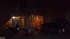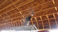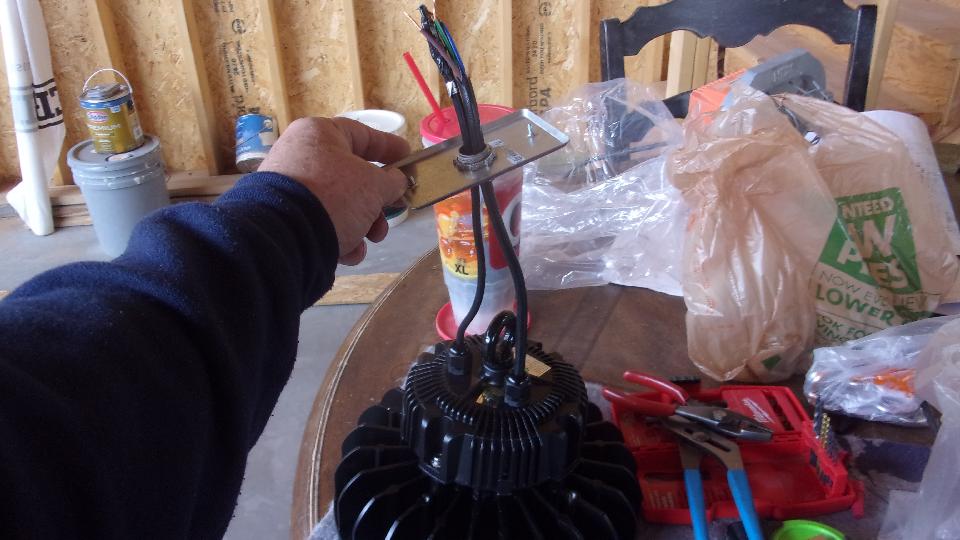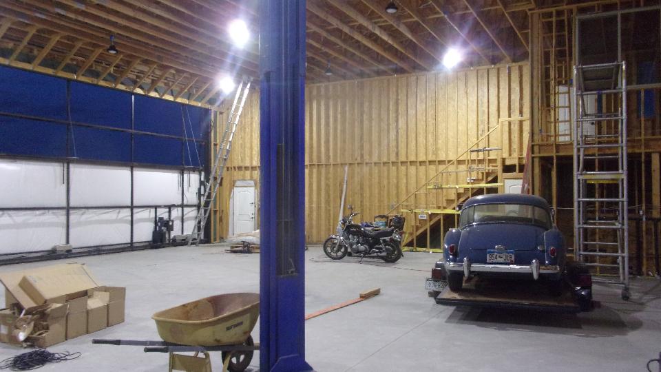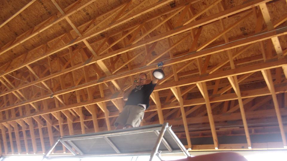 Then time for a break while we waited patiently for night fall before we could see how the new lights would work. Time for a little chat, and then pizza for dinner, and then back to the shop. The lights are wired on two separate 3-way switch circuits, so you can turn on half of the lights or all of them at once. Half of the lights would be the prescribed brightness for normal illumination, and it was indeed good lighting for a hanger or a garage where you park things. But switch on all of the lights together, and ah, what a nice work space. It took a little while to get used to the brighter lights, after which I can say they were really great for a work shop.