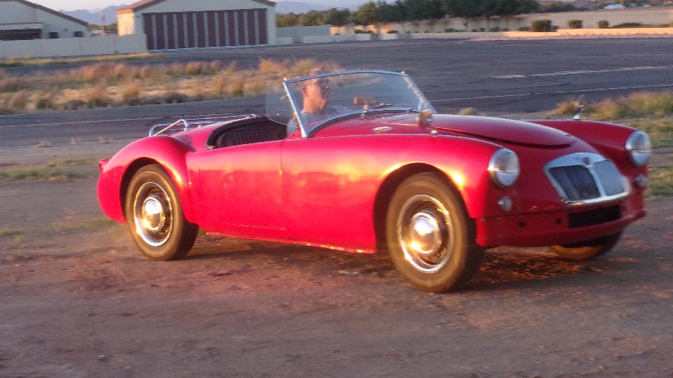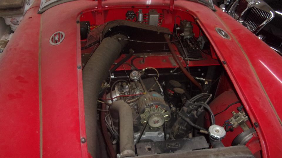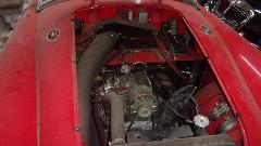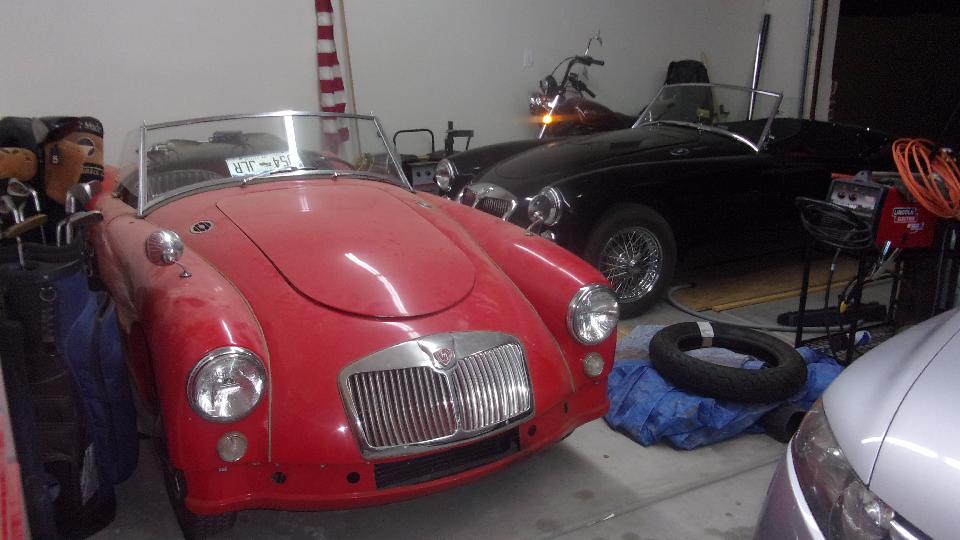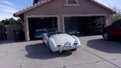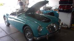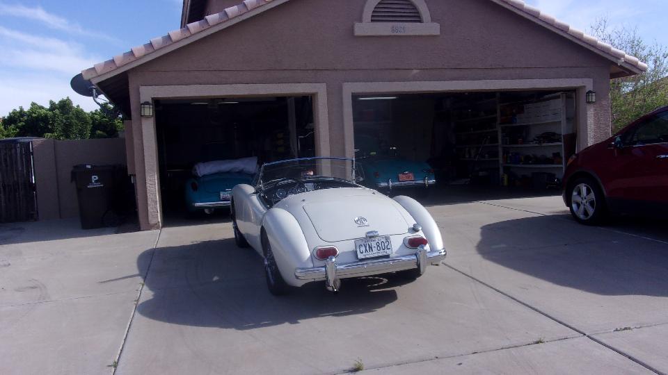 Then we had another appointment, 15 minutes farther west, on a request to visit George Bean at his new digs in Peoria, AZ. The white car is his beautiful MGA 1600-MK-II that normally stays indoors for preservation. The blue car on left inside is his MGA 1500 with the Chevy V6 engine (drool a little more later) and some special body mods. The blue car on the right belongs to a friend and is wanting a little attention today.