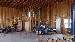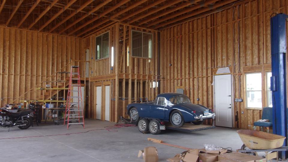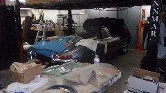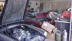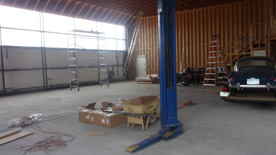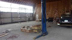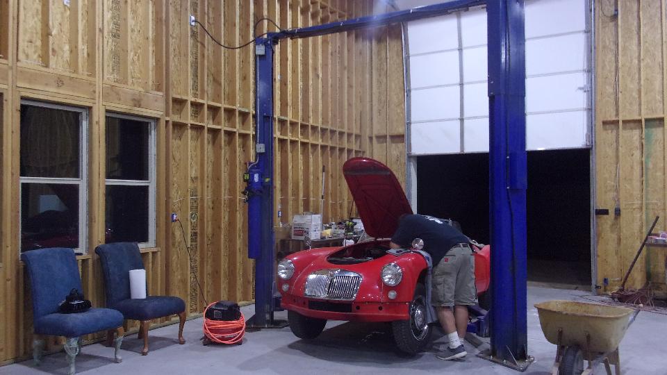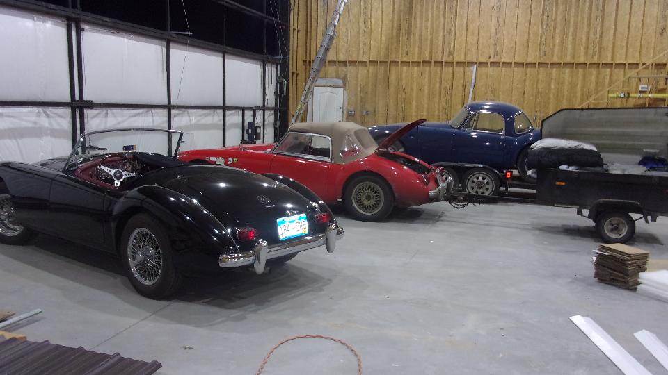 Then we played musical chairs with the cars for a few minutes, moving the Coupe on trailer to the far end, pulling my MGA with the trailer in next, and then the MK-II. What you don't see is the Harley motorcycle in the far end, and the remaining space in the near end, and of course the cars don't take up half of the depth of the hanger. Look the other direction, and notice we pushed the rotary engine MGA into the workspace with the hoist, as we were about to repack the master cylinder that had an internal leak.