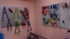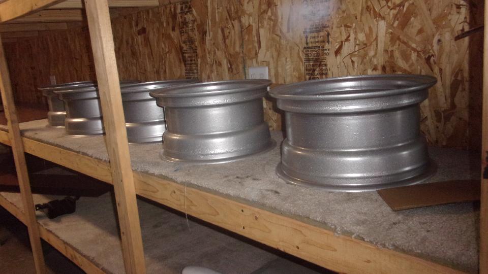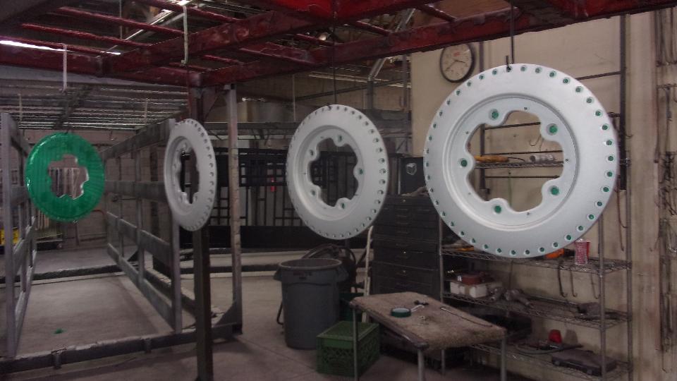 It was a 30 mile drive through rush hour traffic with plenty of delay, but we managed to arrive at Glendale Powder Coating (in Glendale) at 3:50 pm, squeaky close to closing time. But we were expected, and the owner was understanding and happy to give me the 5-minute tour. Front lobby samples and some wheels.
