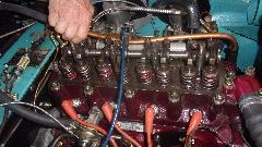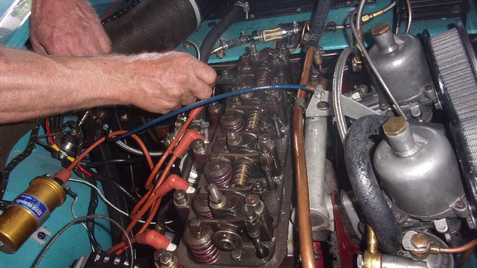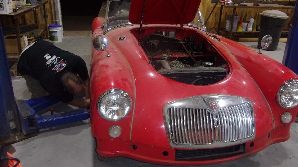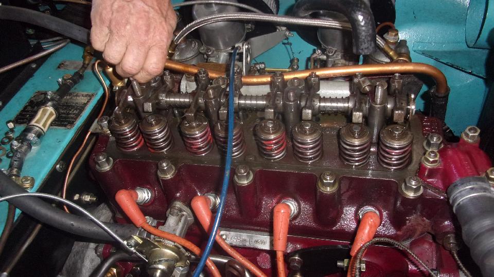 Story is that the freshly rebuilt engine has a special Isky reground cam, which from the spec sheet looks like a fast street cam with a fair amount of extra lift, and rocker clearance spec of 0.018-0.019 inch clearance. For a quick test we reduced rocker clearance to 0.012 all around, but still had the knocking noise. Then we put it up to 0.015 all around (factory spec), and began inserting a feeler gauge in the rockers while it was idling. Finally the noise mostly went away with the feeler stuck in the number 4 intake rocker (no difference anywhere else). Running out of time for the day, we tried a different pushrod in that position with no change. We finally had to conclude that there was something amiss with the no.4 intake cam lobe, so the cam was going to have to come out for inspection, a job for another day. At day's end George's MGB came out as a loaner for friend to drive home, as the MGA wasn't going anywhere until the cam problem was resolved.