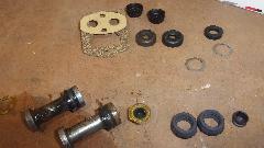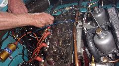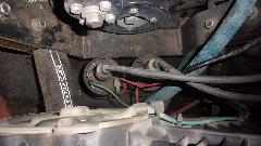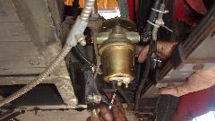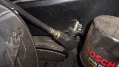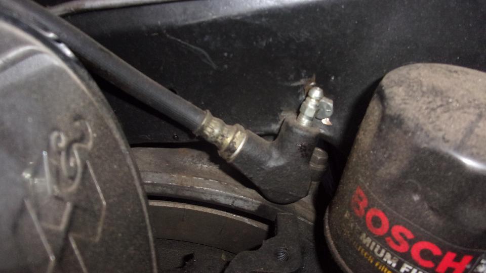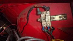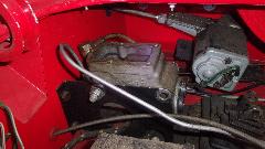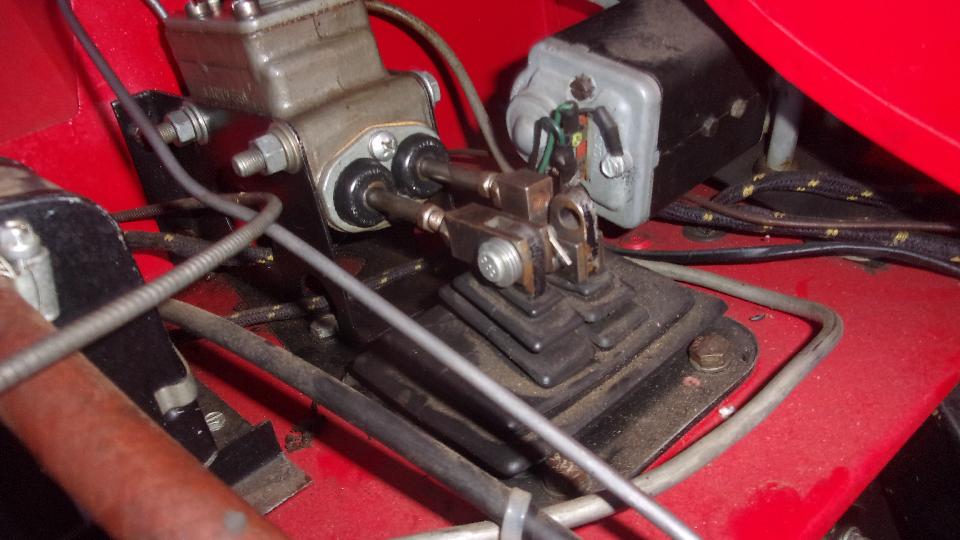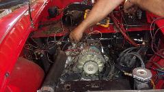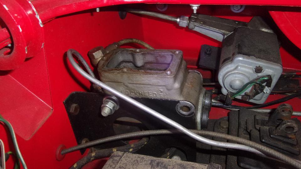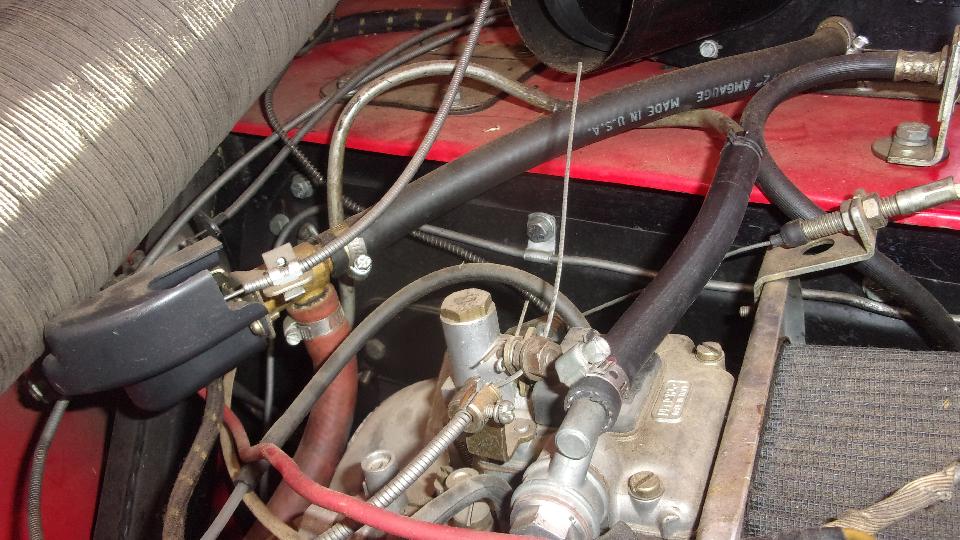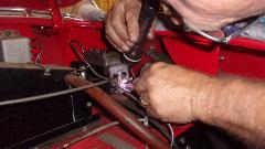 By then we had gotten down to work in Randy's rotary engine MGA, determined to get it running. Might as well install the seats, as that didn't take long. Having repacked the master cylinder, we got the brakes to bleed out okay but were having a fiddle with bleeding the clutch. The Mazda clutch has a 3/4-inch bore slave cylinder, which in itself is not the problem. But this required a shorter throw for the output end of the clutch pedal, which was accomplished by drilling a second hole lower down and making an offset clevis to match. Cute, and odd, but it works. We finally used a rubber bung form a compression tester as an adapter to use an air pressure hose on the master cylinder fill port. That got the clutch to bleed out okay.
