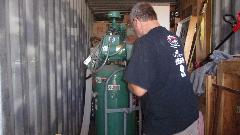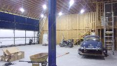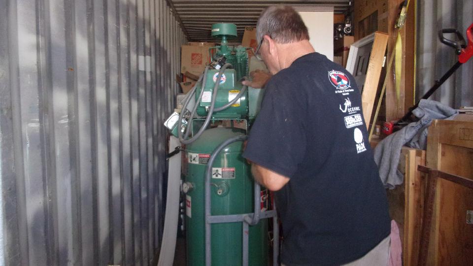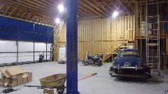 The new LED lights came in yesterday, so today we got busy installing them. With a little team work, I was prewiring them on the bench while Randy was up the scaffolding hanging them in the rafters. In due time we had 14 out of 15 new lamps installed and working, only one had a dim glow and would have to be returned for exchange. We also fished a nice air compressor out of the storage locker and hauled that into the shop (to be installed later).
