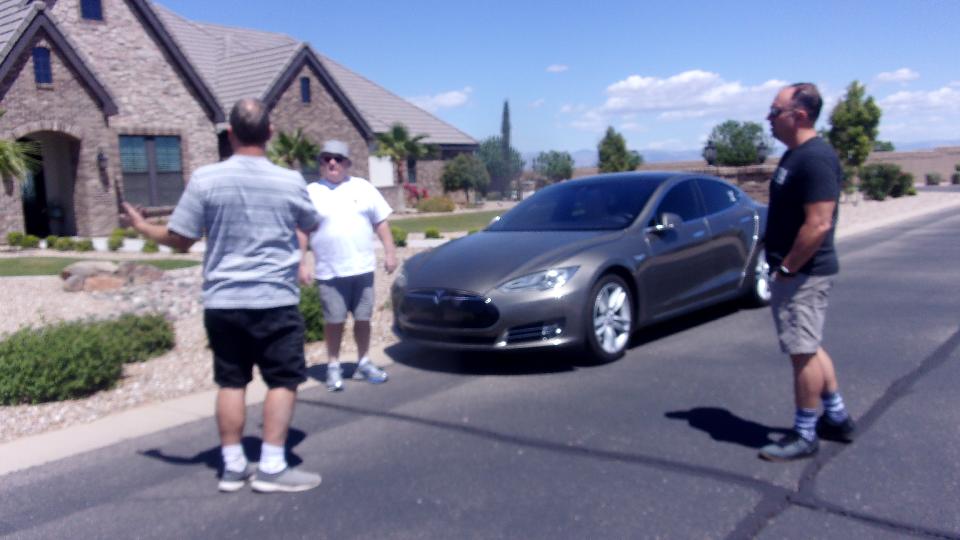 couple of friends showed up in a Tesla. The guy in the white shirt is Bear Holms from Apache Junction, AZ. We were at his place two years ago in April 2017. The Tesla belongs to his fiend. Bear had come to drop off a good used screenwiper motor for my car, in case I might need it (as mine has been giving us problems). They wanted to check out the new hanger, otherwise didn't stay long.