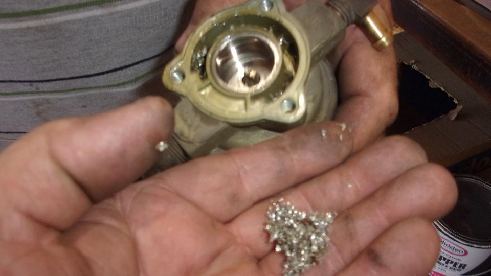 Then we were after the battery and the fuel system. The battery was duff, so get the truck and jumper cables. Put some gas in the tank, switch on, but no sound from the fuel pump. This was a high performance rotary pump with a pressure regulator before the carburetor. It would gently hum and get warm, but was not pumping fuel. Pump out and disassemble revealed the pump motor was seized, but that was freed up with a little twisting on the motor shaft. The pump head was also full of aluminum shavings, apparently left from drilling and tapping the custom aluminum fuel tank some years ago so clean that crap out. Back together and installed, good whirring sound but still not pumping. Swap the two wires on the pump to make it run the right way, and it was working. Fuel hoses up front needed changing, and the pressure regulator was removed at the same time (possibly a mistake).