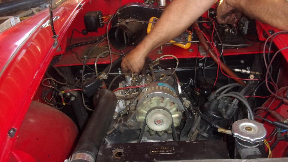 There was a brief fiddle with the ignition system, having two ballast resistors to go with two ballasted ignition coils, but no bypass wires for the resistors. That made for low voltage while cranking, until we used jumper wires to bypass the resistors, and then it was running, for the first time in five years. Big grins all around.